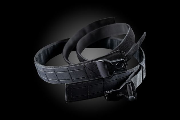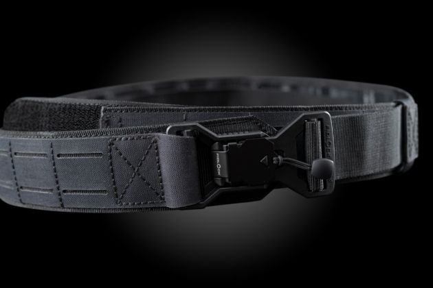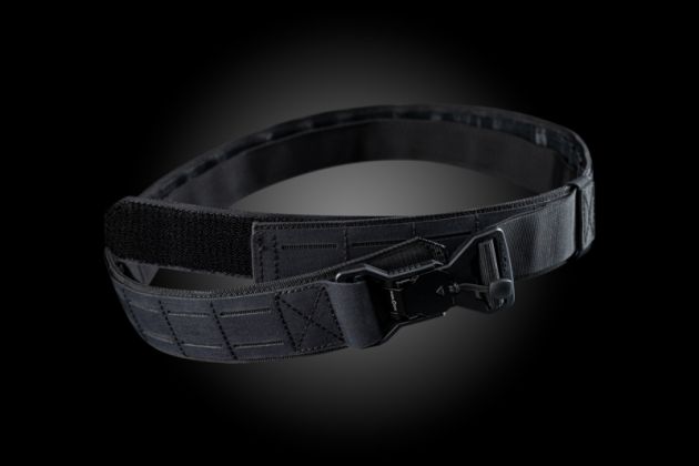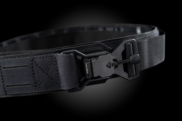 Shooters belt with a laser cut carrying system (fully compatible with MOLLE) for attaching magazine pouches and other tactical equipment. It is equipped with a FIDLOCK V-Buckle.