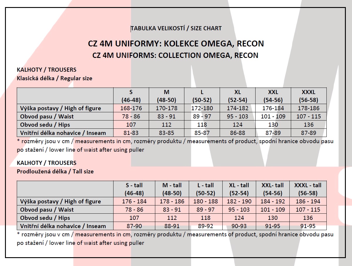 Pants for reconnaissance and combat operations 4M RECON LS (Light Season) is based on the requirements of the reconnaissance units of the Army of the Czech Republic. They are made of high-strength polyester fiber (PES) material with a ripstop grid and the best cotton yarn that is soft and comfortable for most of the conditions under which they are intended to be used. The basic material is distinguished by its high breathability and strength. LS pants are designed for use in warm weather conditions, etc. The material is equipped with a special TEFLON® finish, which is bonded to textile fibers. This ensures long-lasting efficiency against water, oils,
