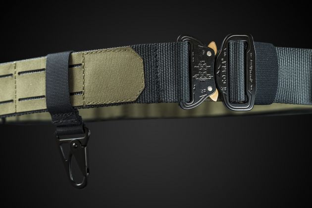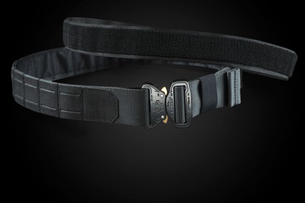 Shooters belt with a laser cut carrying system (fully compatible with MOLLE) for attaching magazine pouches and other tactical equipment. It is equipped with a COBRA® buckle.